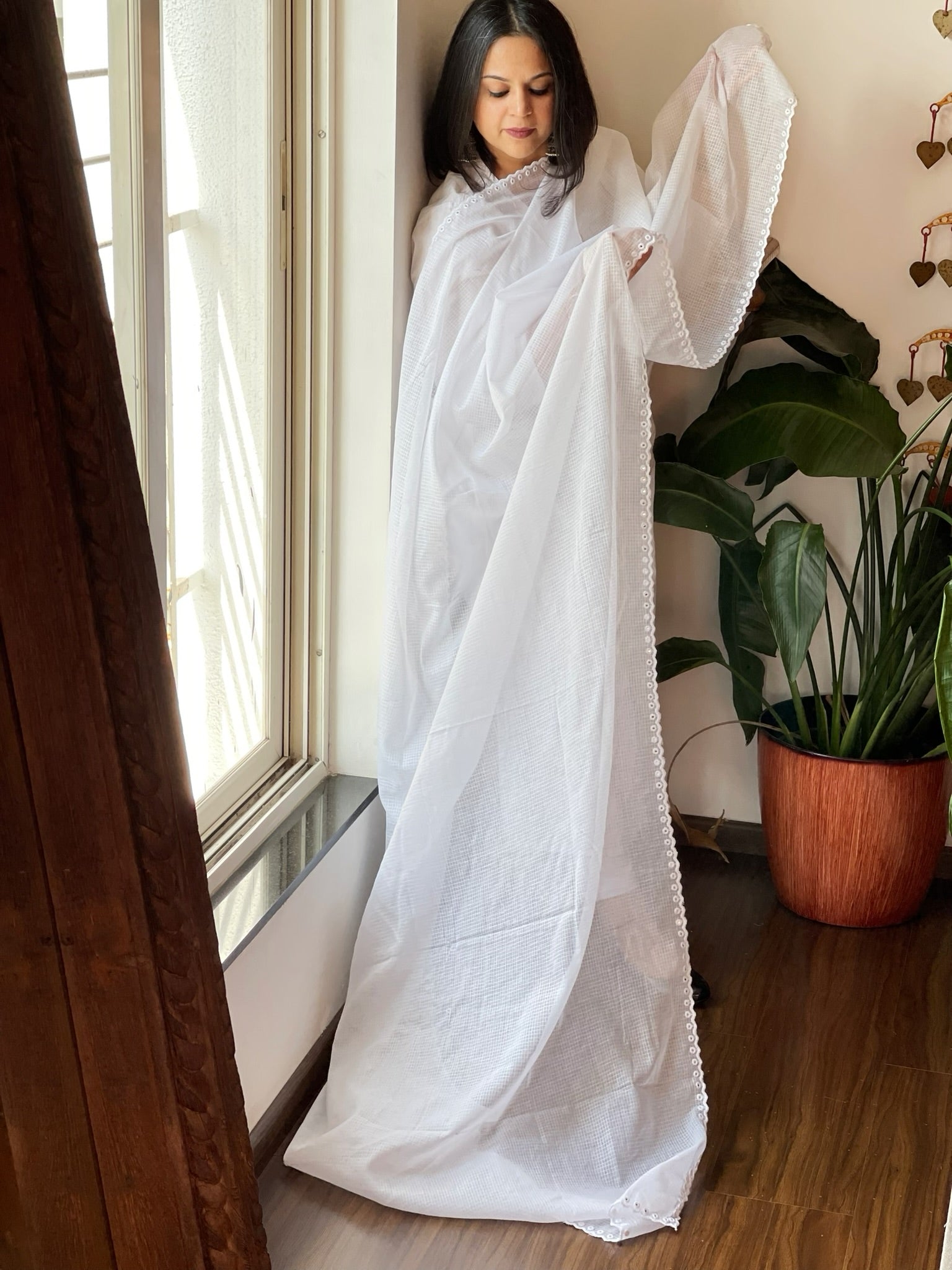 White Kota Cotton Dupatta with Embroidery and foil mirror work