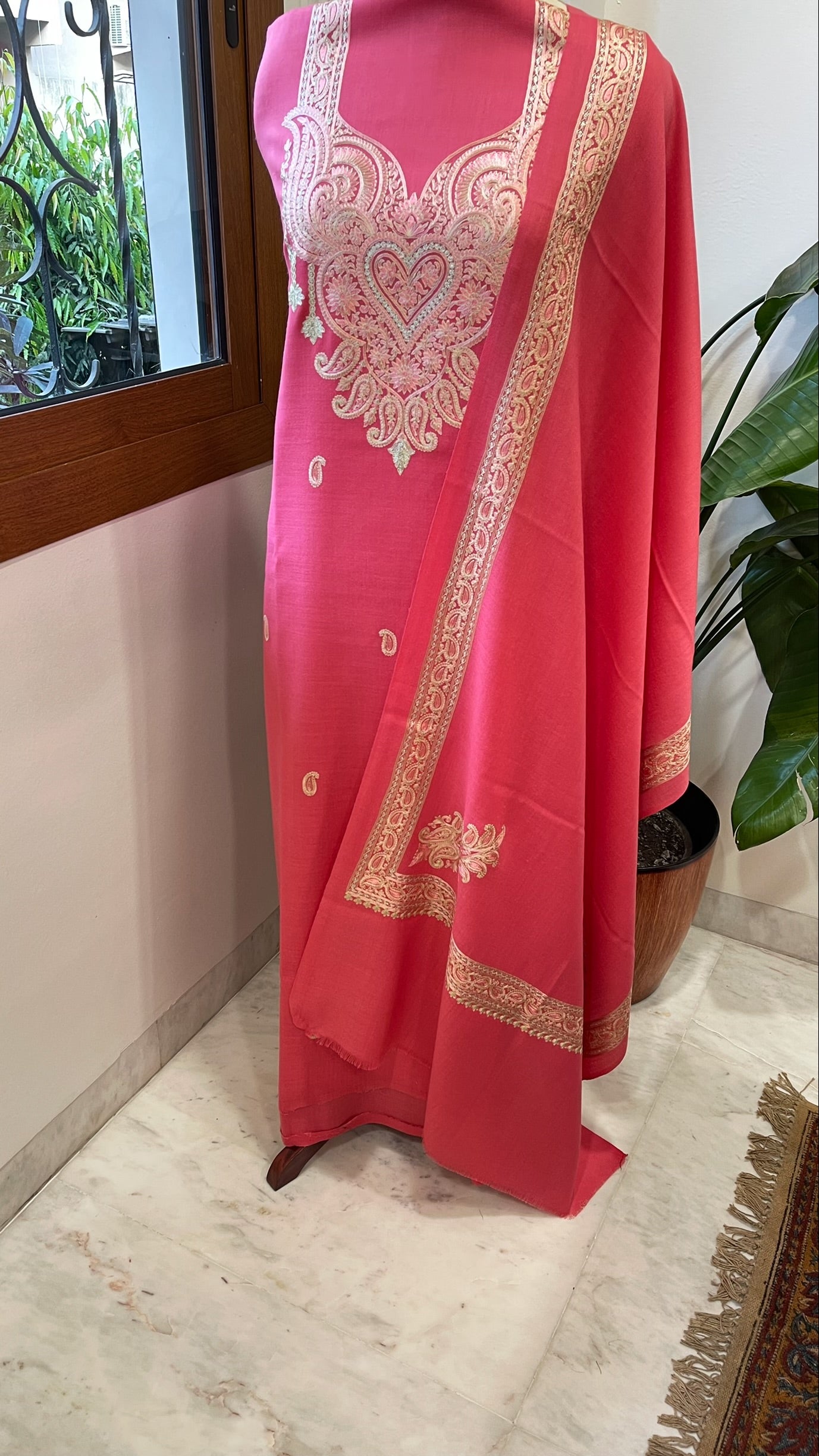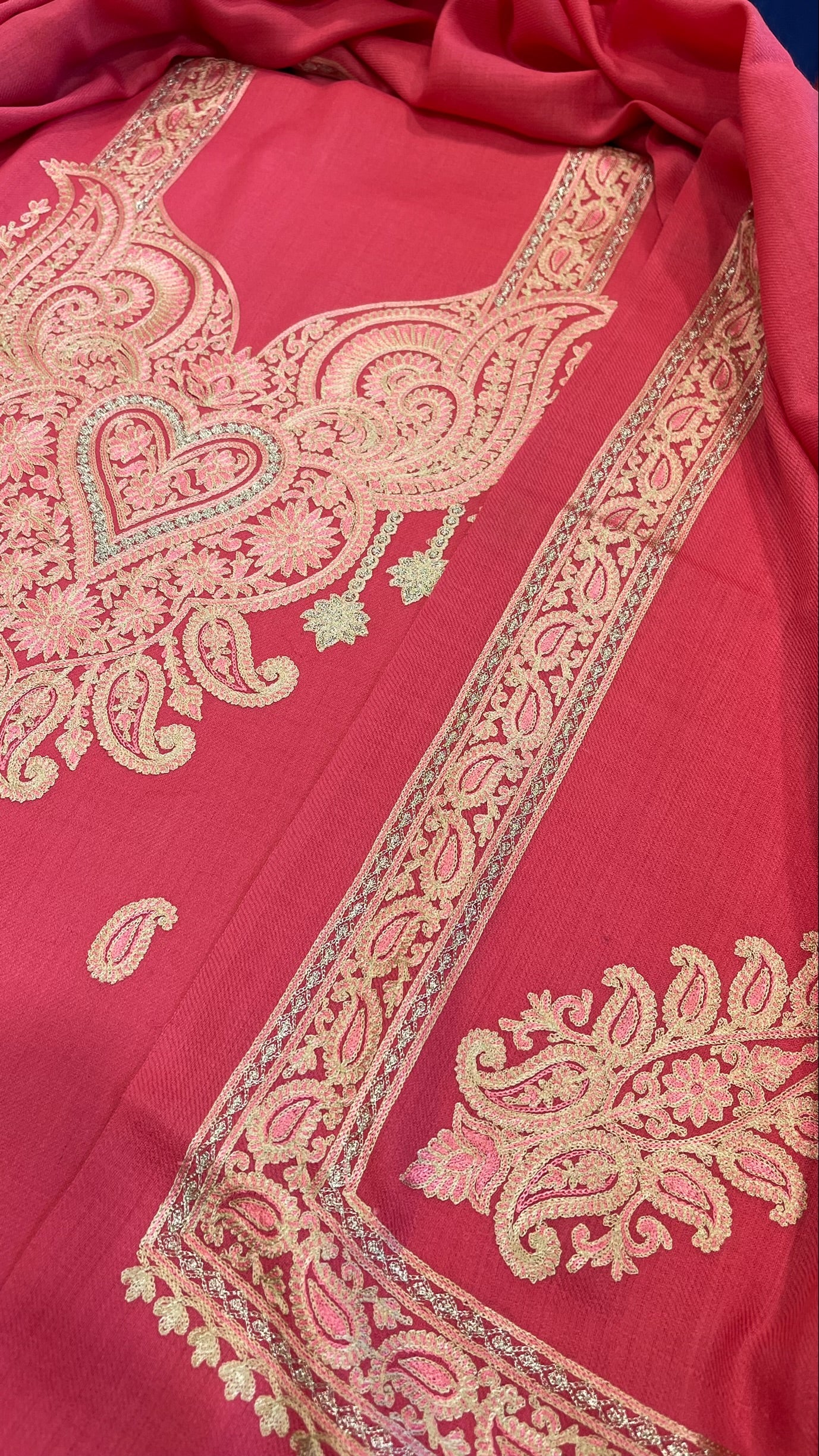 Embrace winter elegance with this sophisticated 3-piece suit set, expertly crafted from lightweight pashmina wool that delivers warmth without bulk. Adorned with intricate Aari embroidery, it is warm, stylish and graceful.
