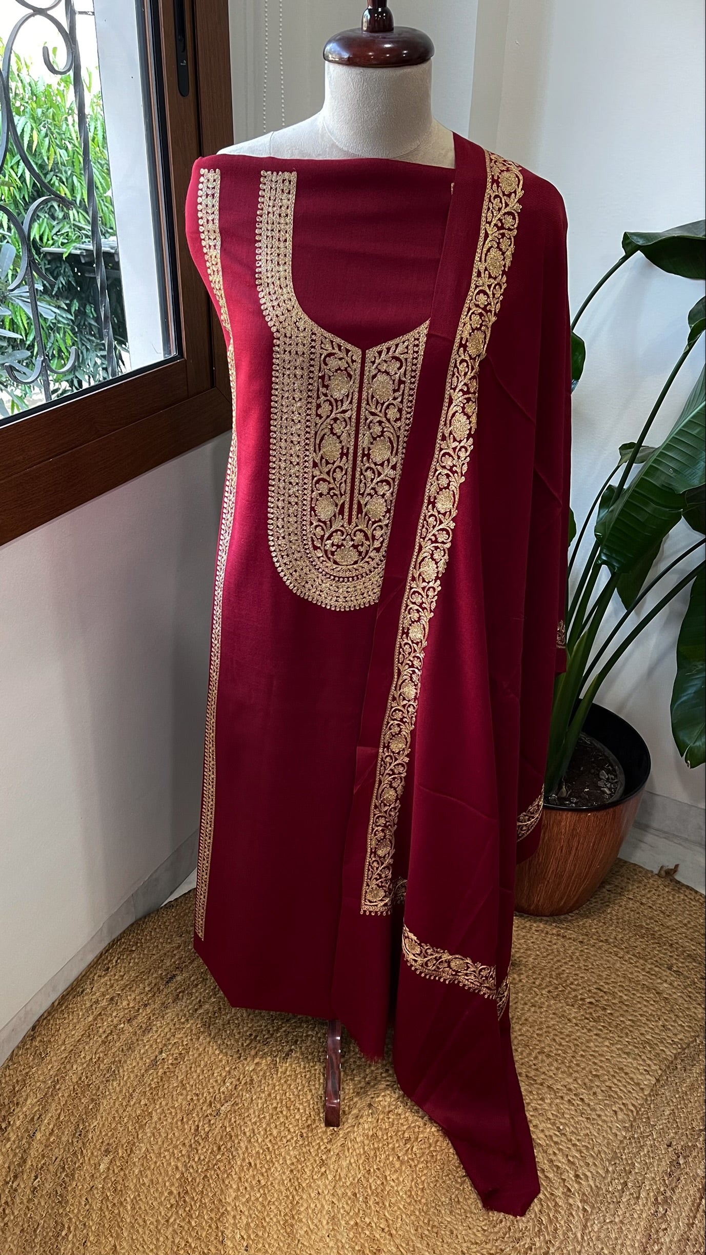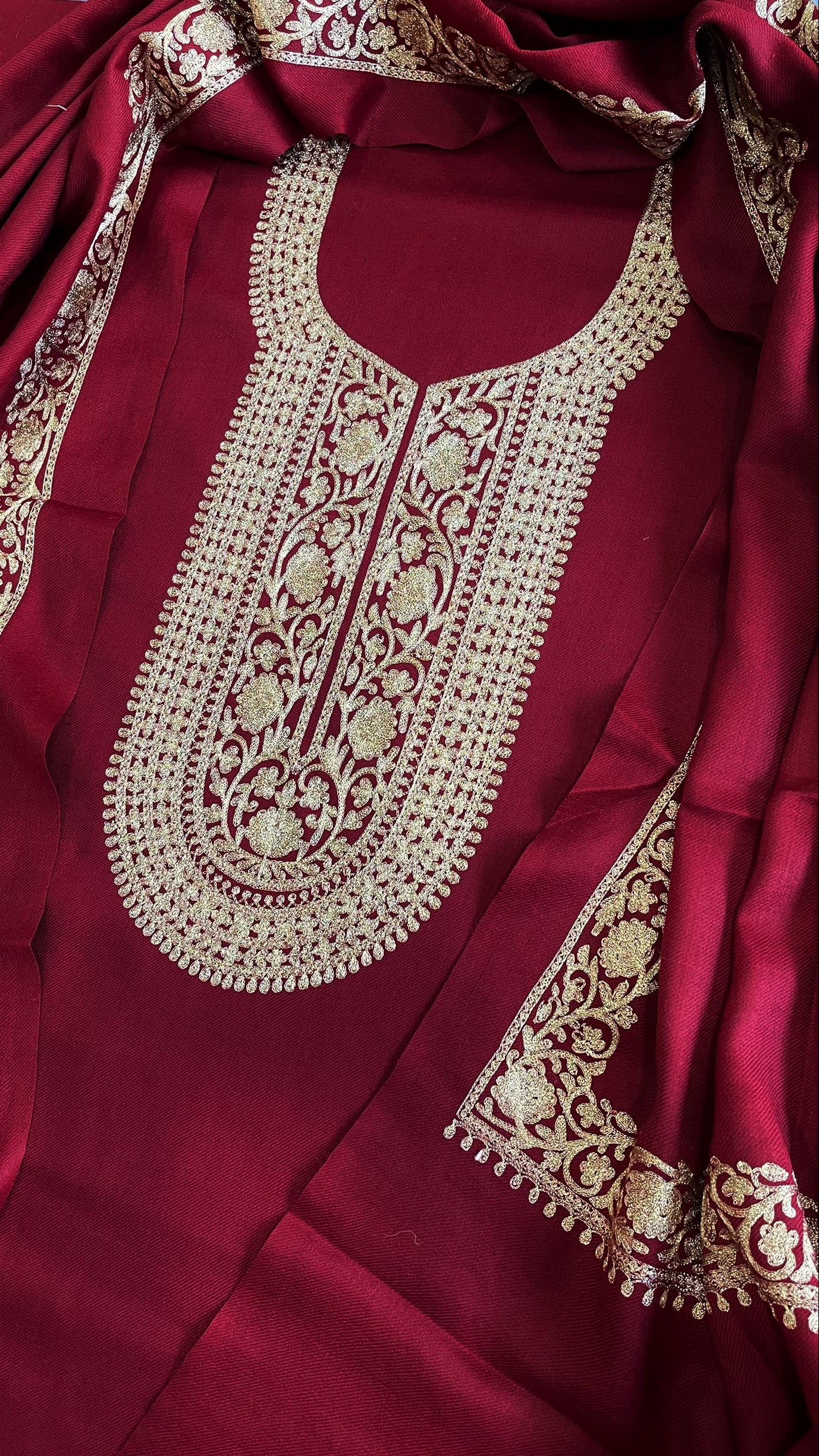 Maroon Winter Suit Set with Aari Work in Pashmina Wool