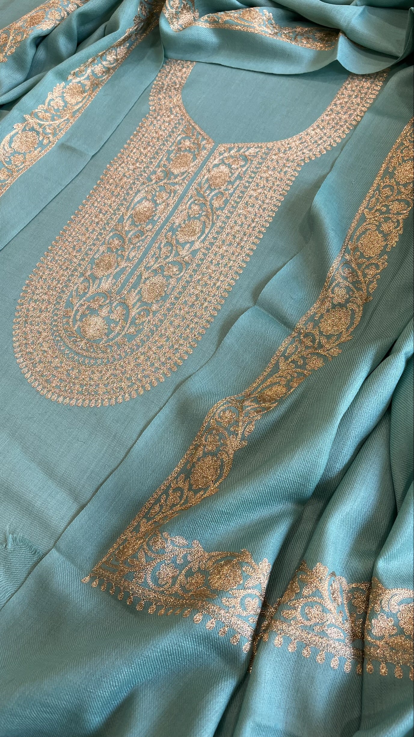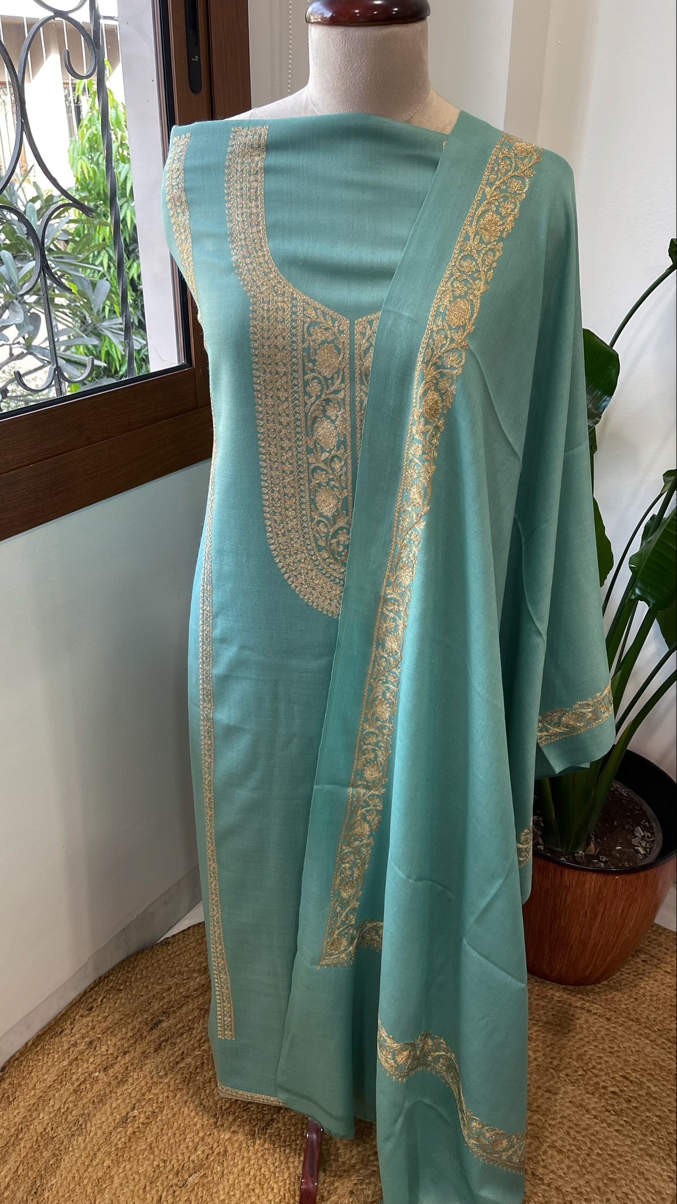 Embrace winter elegance with this sophisticated 3-piece suit set, expertly crafted from lightweight pashmina wool that delivers warmth without bulk. Adorned with intricate Aari embroidery, it is warm, stylish and graceful.