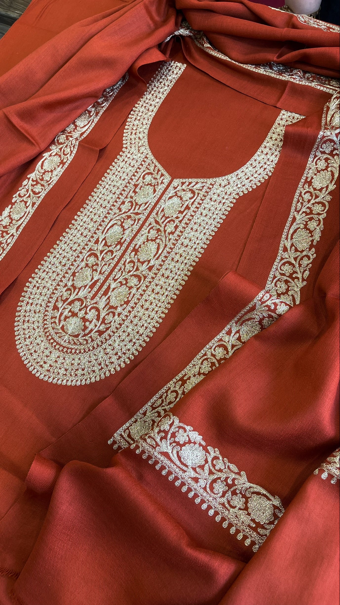 Rust Winter Suit Set with Aari Work in Pashmina Wool