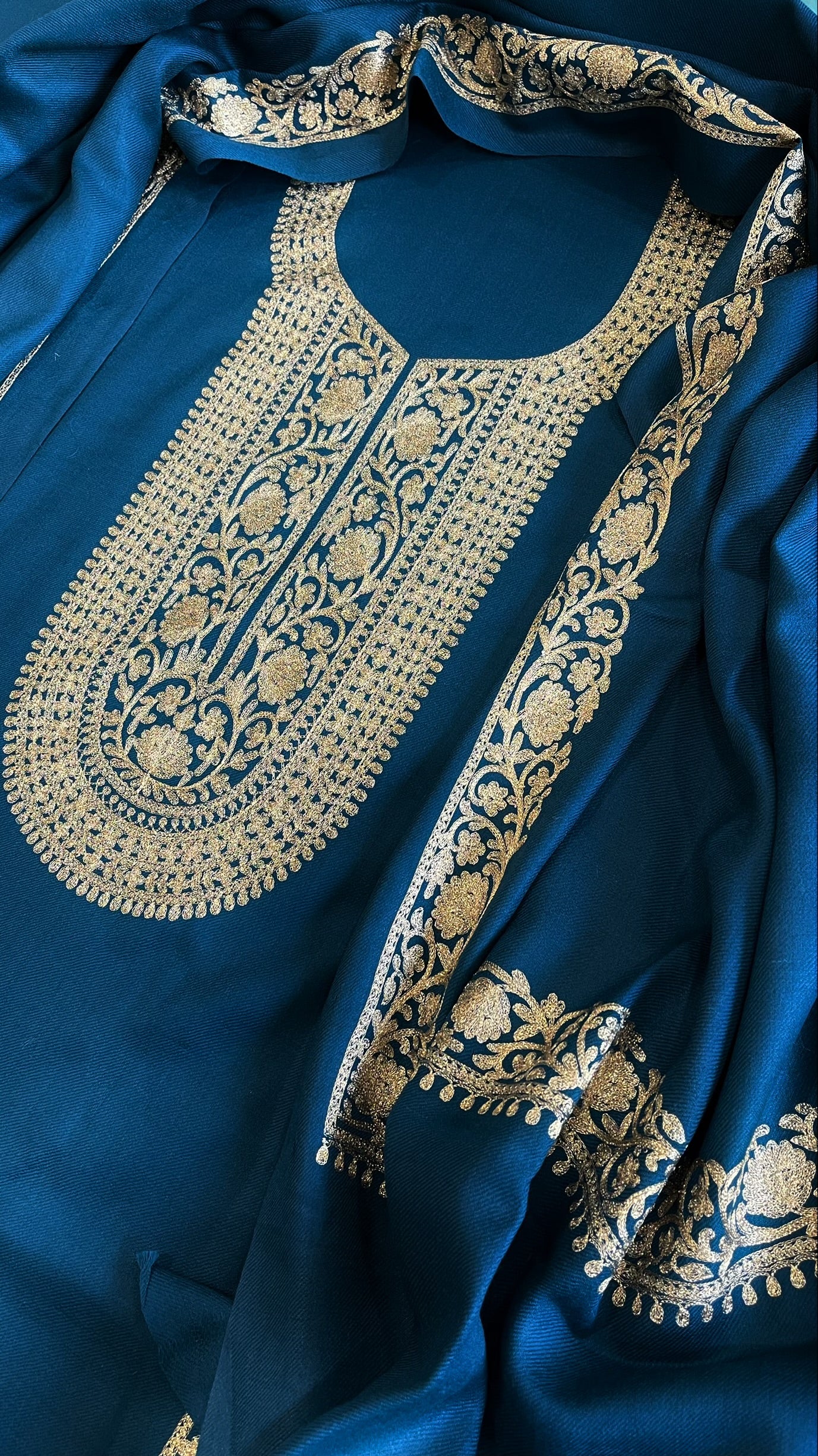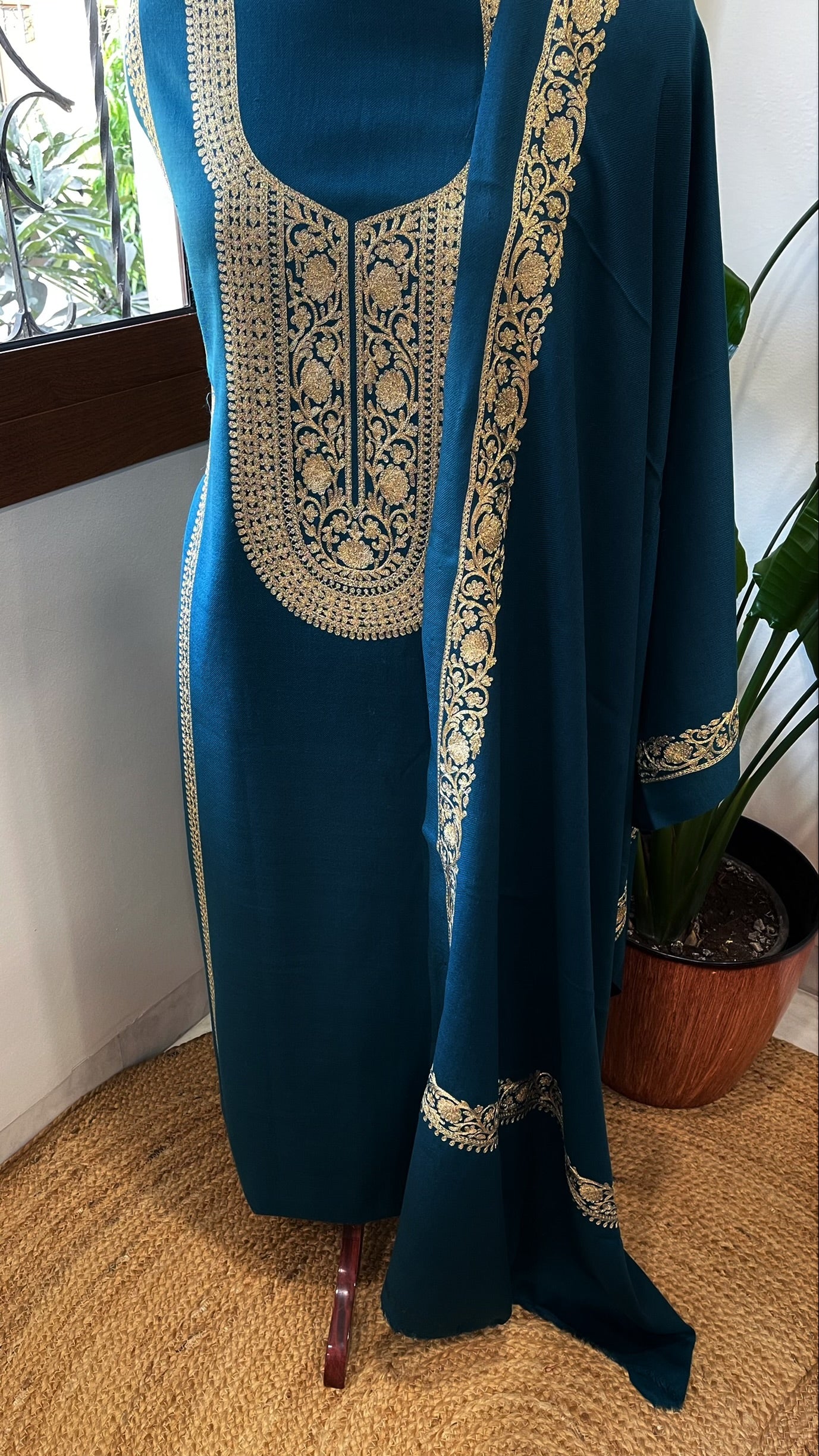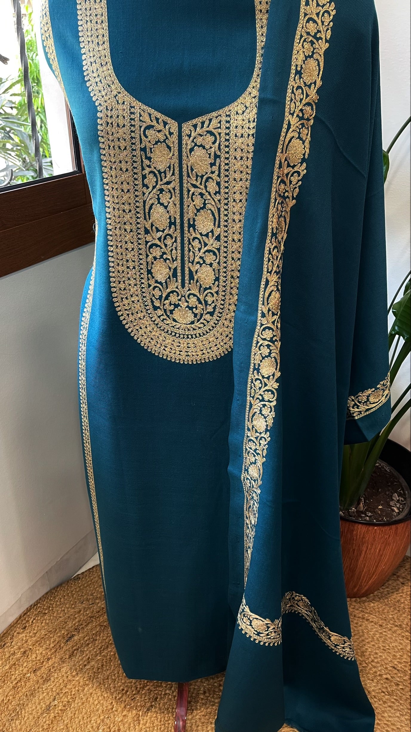 Firozi Winter Suit Set with Aari Work in Pashmina Wool