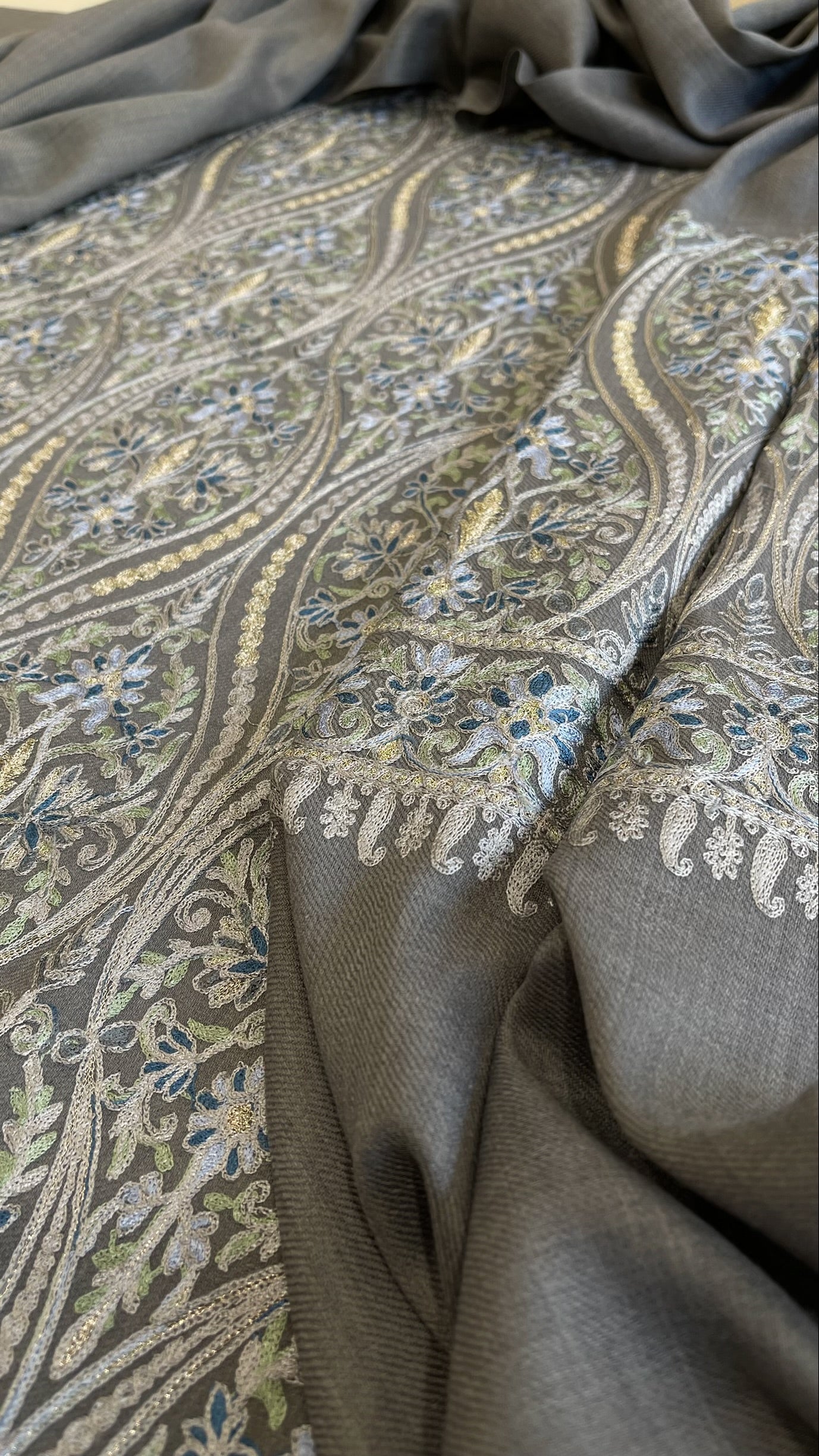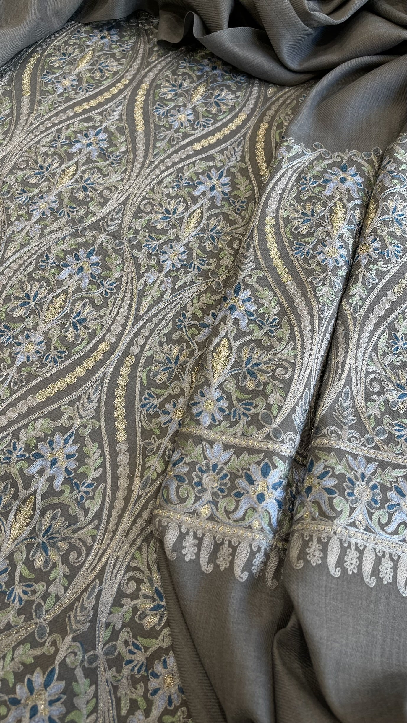 Lite Grey Winter Suit Set with Aari Work in Pashmina Wool