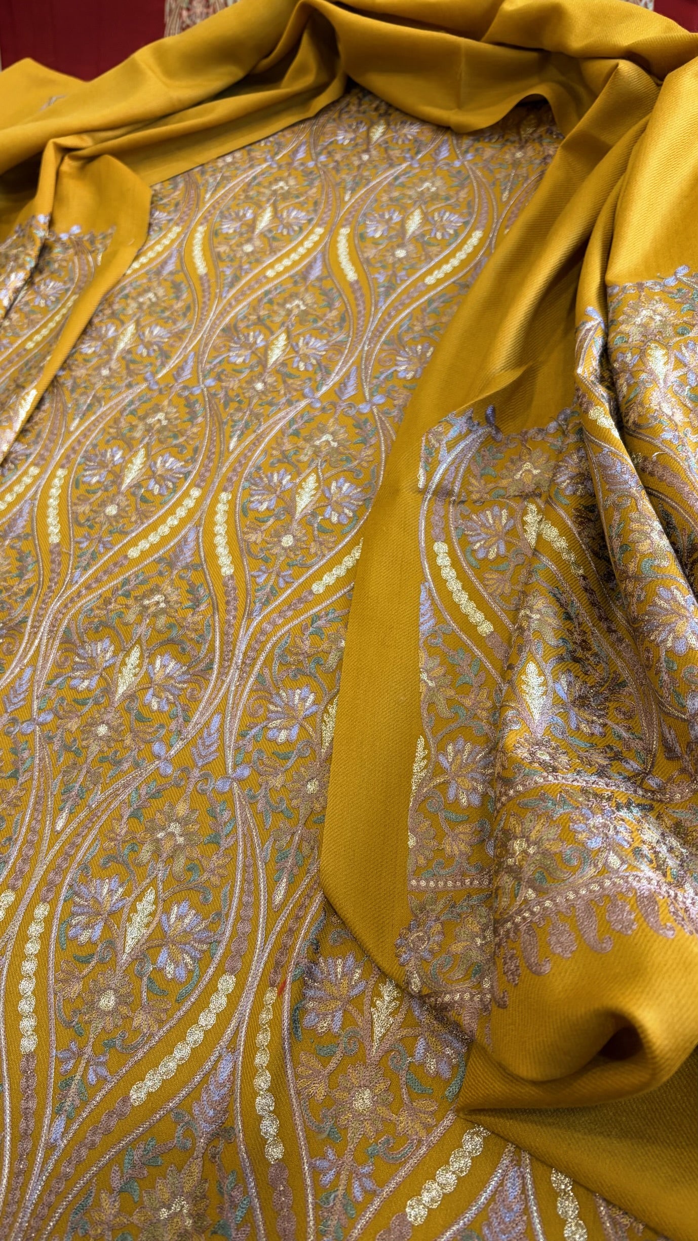 Mustard Winter Suit Set with Aari Work in Pashmina Wool