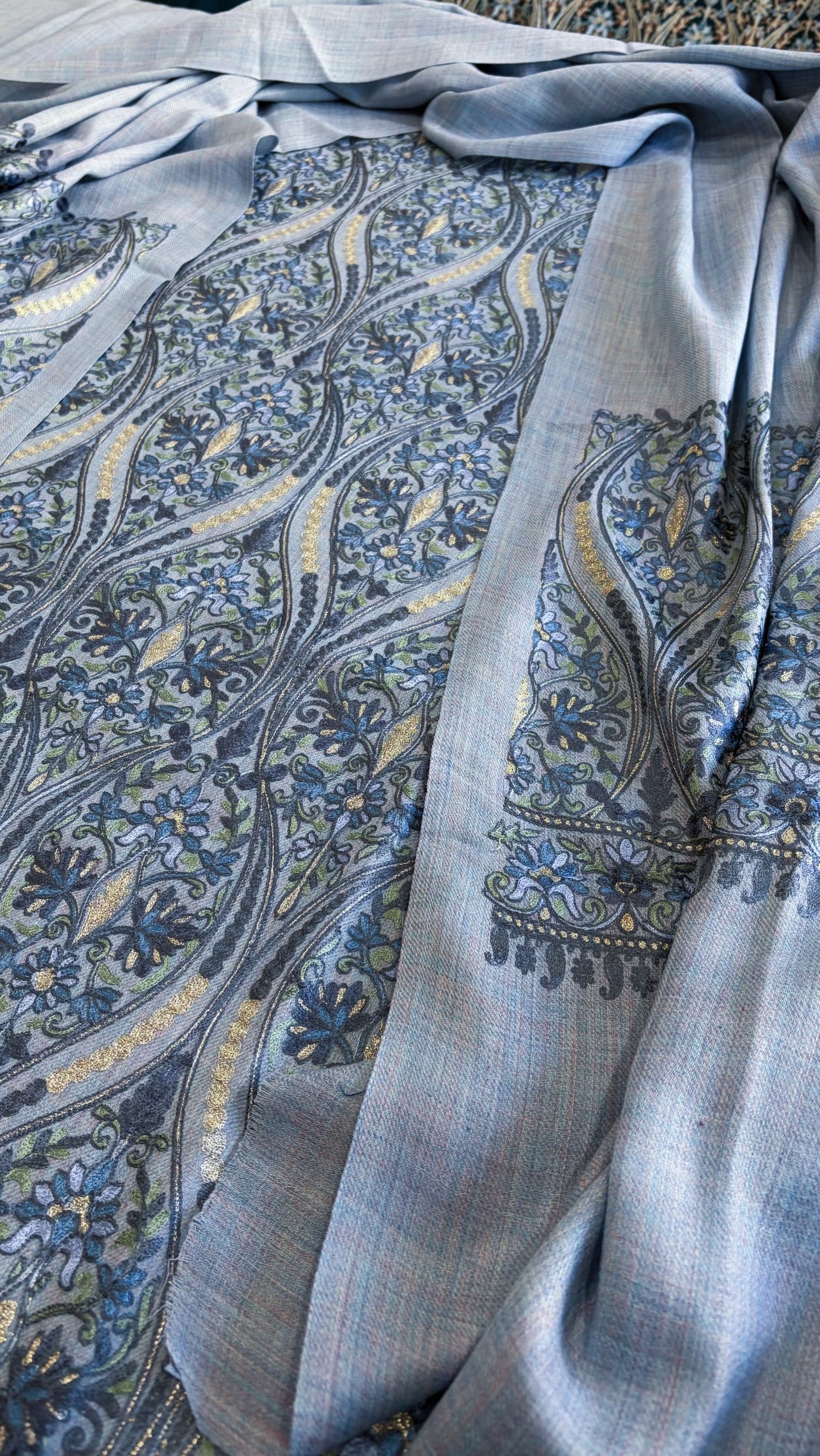 Powder Blue Winter Suit Set with Aari Work in Pashmina Wool