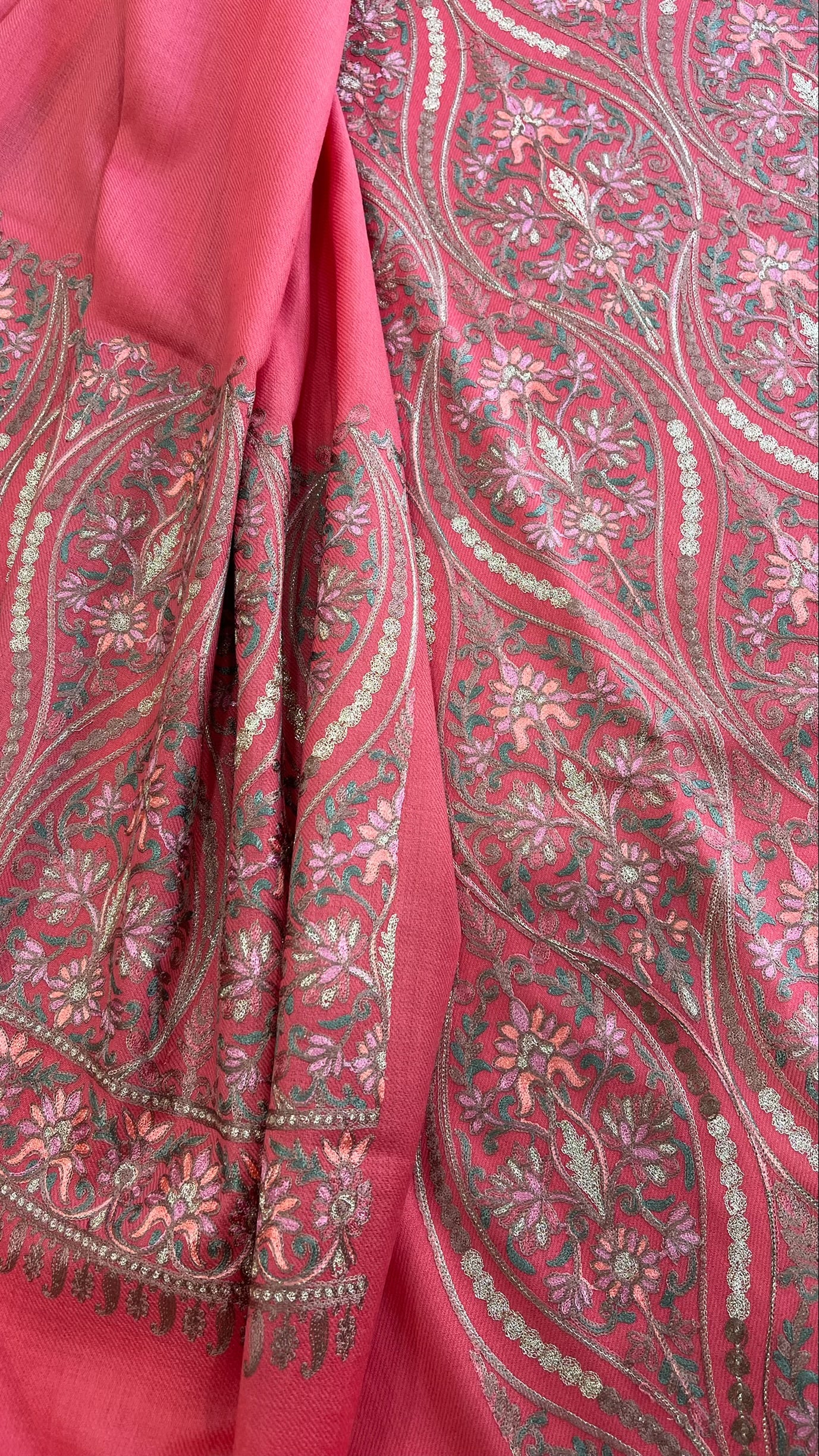 Pink Winter Suit Set with Aari Work in Pashmina Wool