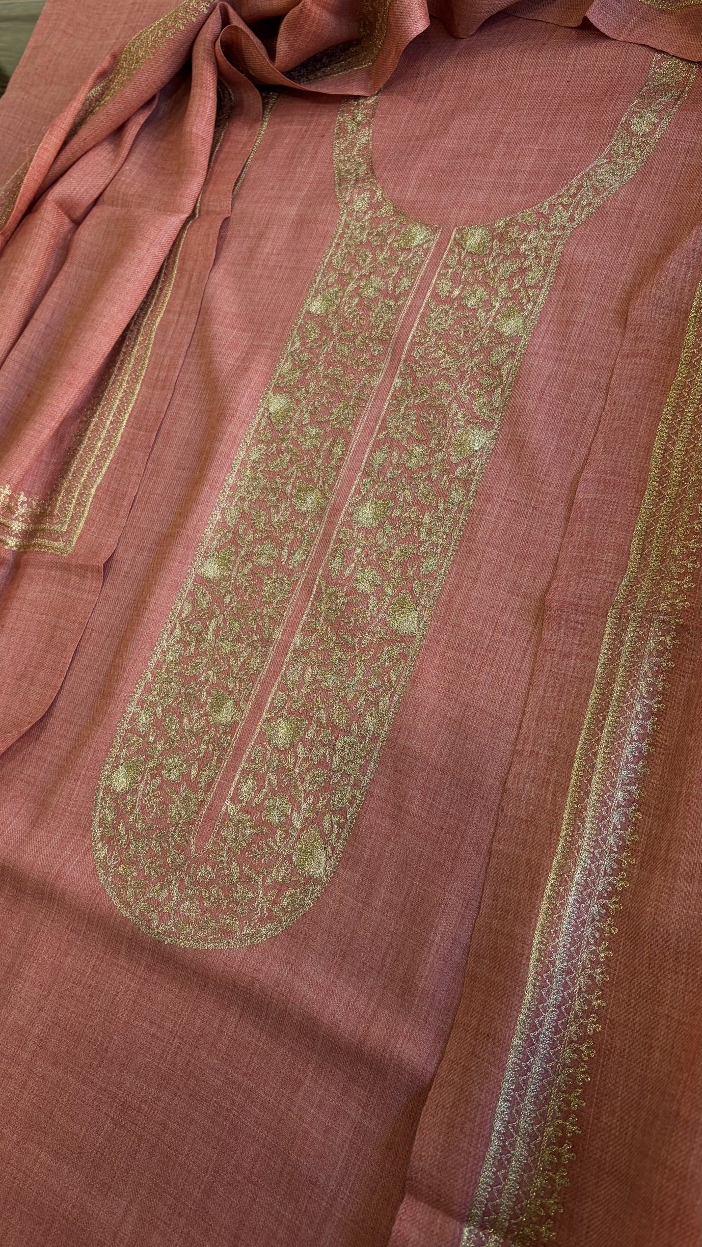 Peachish Pink Winter Suit Set with Aari Work in Pashmina Wool