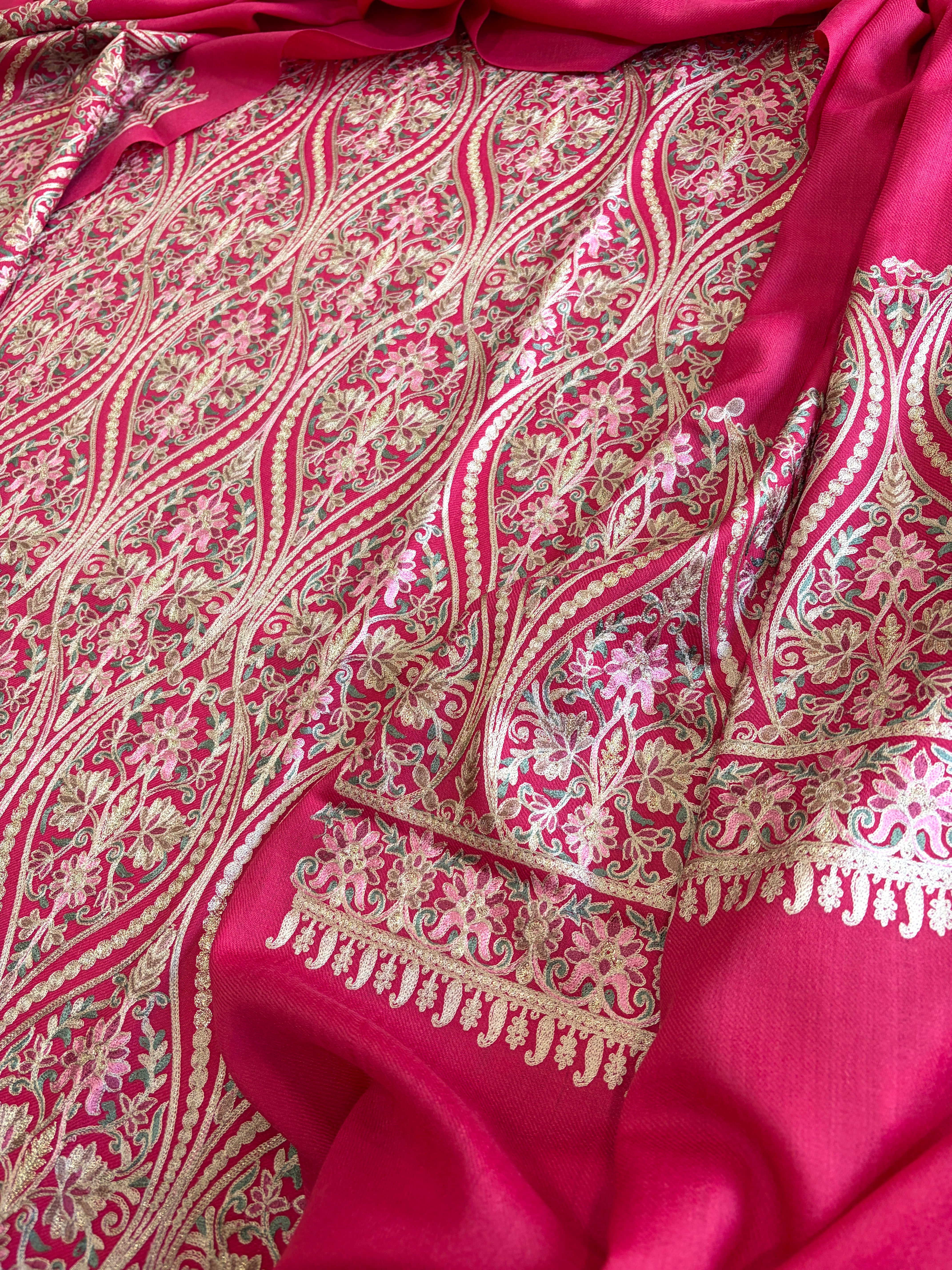 Embrace winter elegance with this sophisticated 3-piece suit set, expertly crafted from lightweight pashmina wool that delivers warmth without bulk. Adorned with intricate Aari embroidery, it is warm, stylish and graceful.