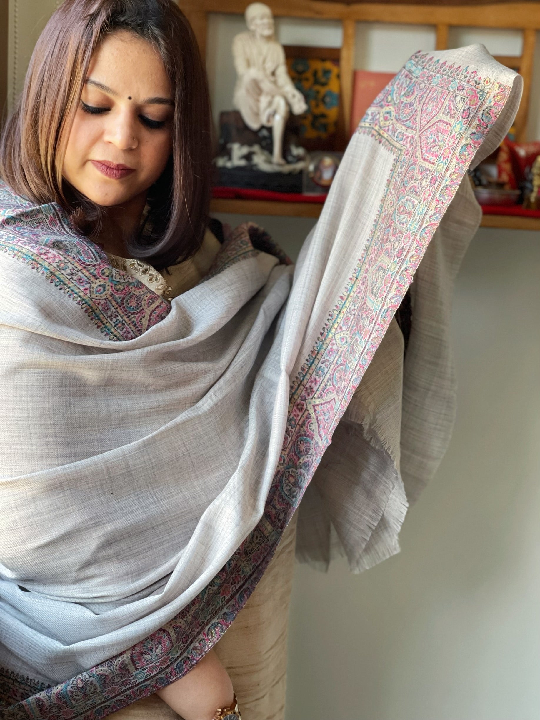Grey Woven Pashmina Shawl with Kaani Zari Border