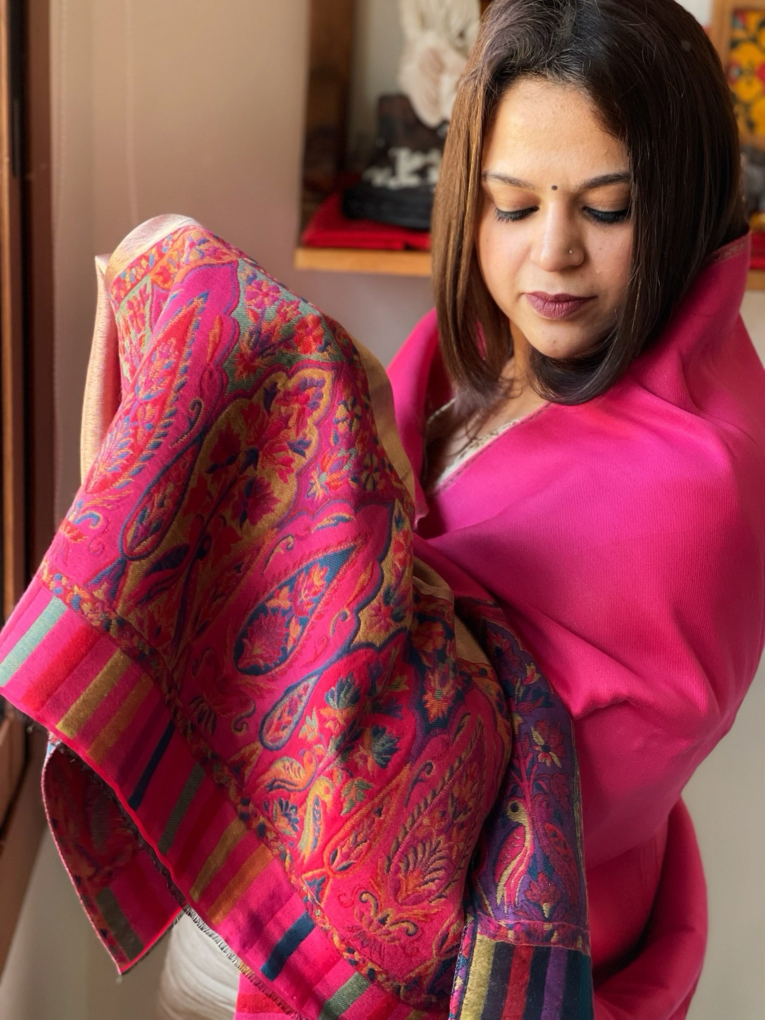 Stay warm and stylish this winter with our Woven Woollen Reversible Zari Shawl with Kaani Pallu. Made with high-quality wool, its intricately woven Kaani design adds a touch of beauty and elegance. Lightweight yet cozy, it's the perfect addition to your winter wardrobe.