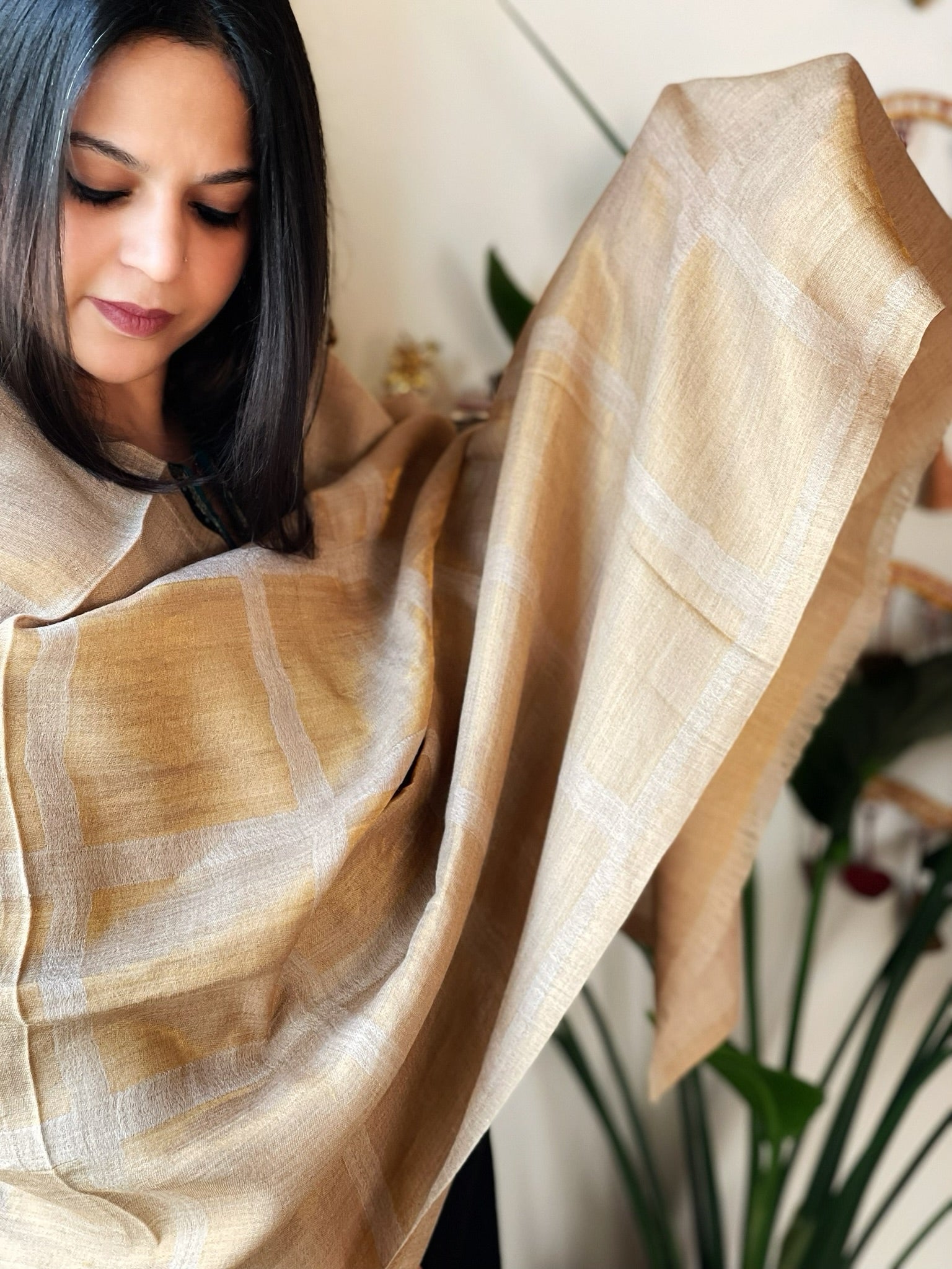 Lite Brown Woven Zari Pashmina Check Design Stole