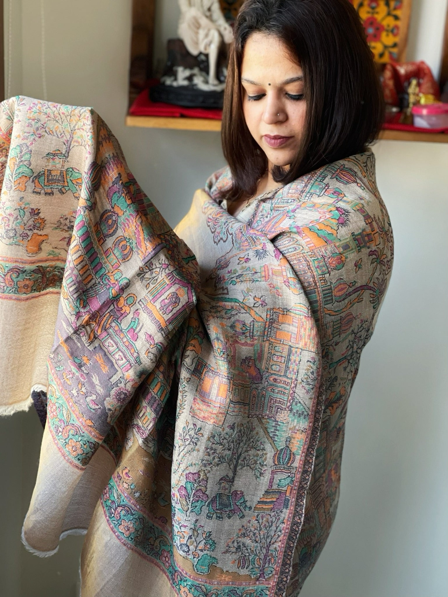 Experience a luxurious blend of warmth and style with our gorgeous Pashmina Shawl with Zari and Kaani Border and Kaani Pallu. Made from pure wool, these stoles are not only warm and cosy, but also lightweight and perfect for winter weather. Elevate your winter outfits with the intricate zari detailing.