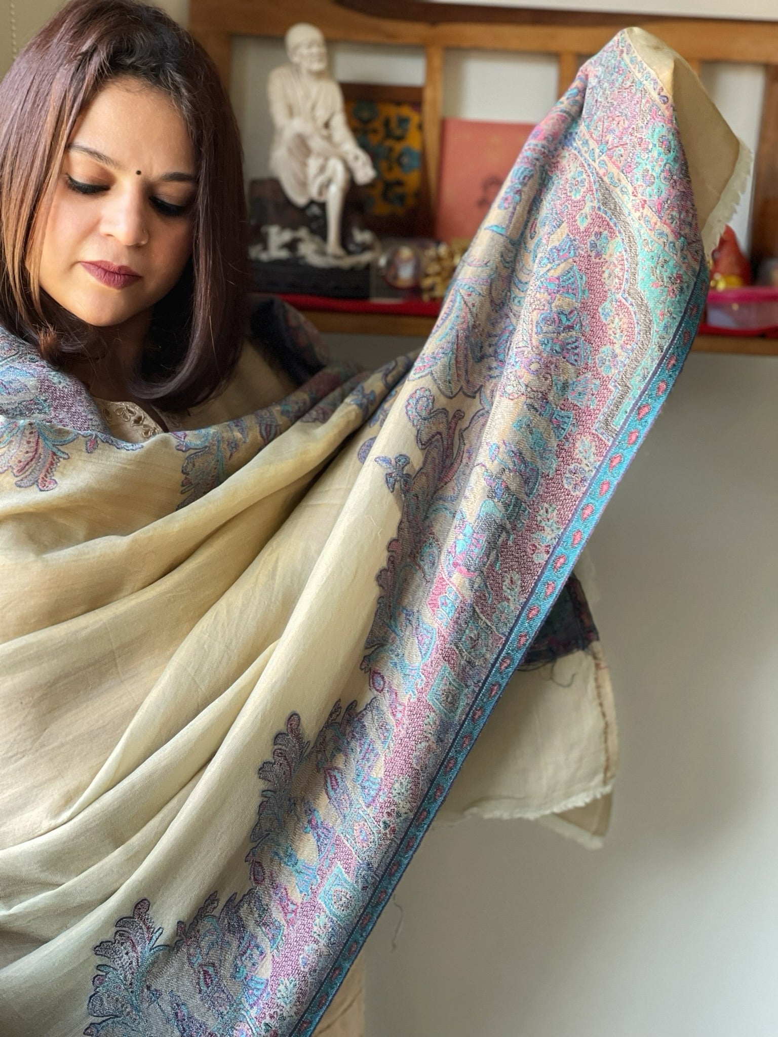 Experience a luxurious blend of warmth and style with our gorgeous Pashmina Shawl with Zari and Kaani Border and Kaani Pallu. Made from pure wool, these stoles are not only warm and cosy, but also lightweight and perfect for winter weather. Elevate your winter outfits with the intricate zari detailing.