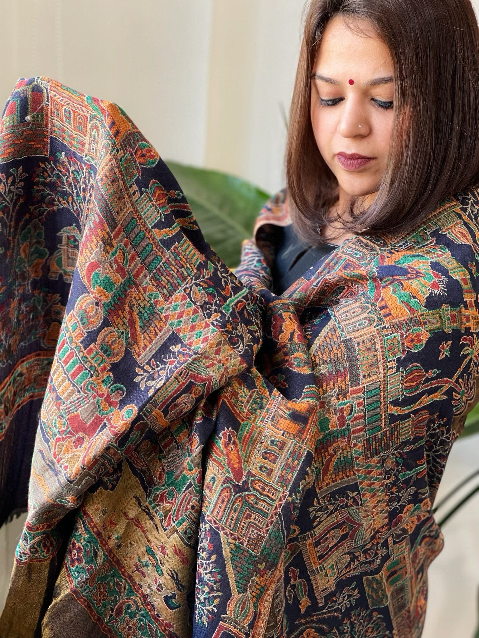 Navy Woven Zari Pashmina Shawl with Kaani Design Border & Pallu