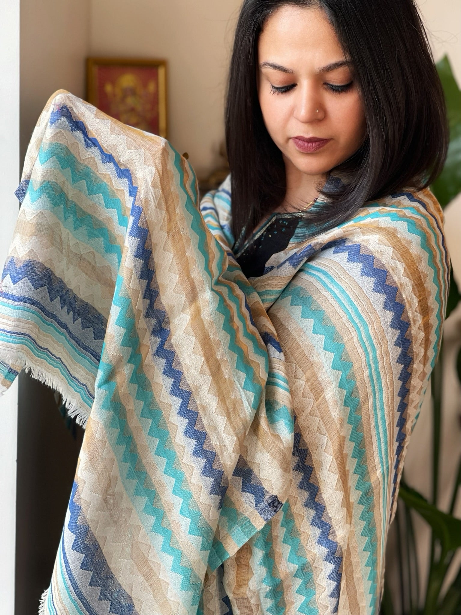 Off-White, Blue, Turquoise Woven Zari Pashmina Stole with Zig-Zag Design