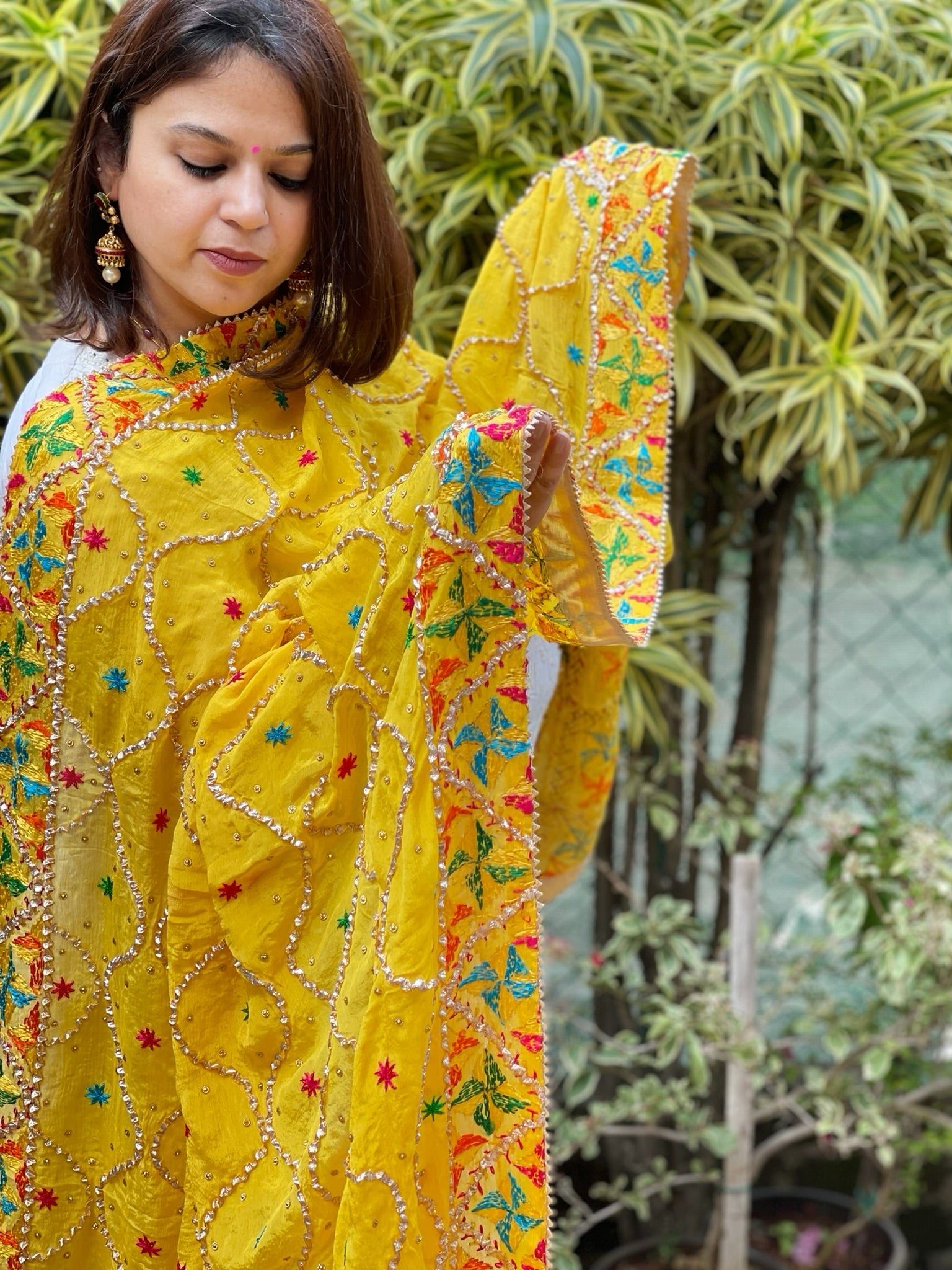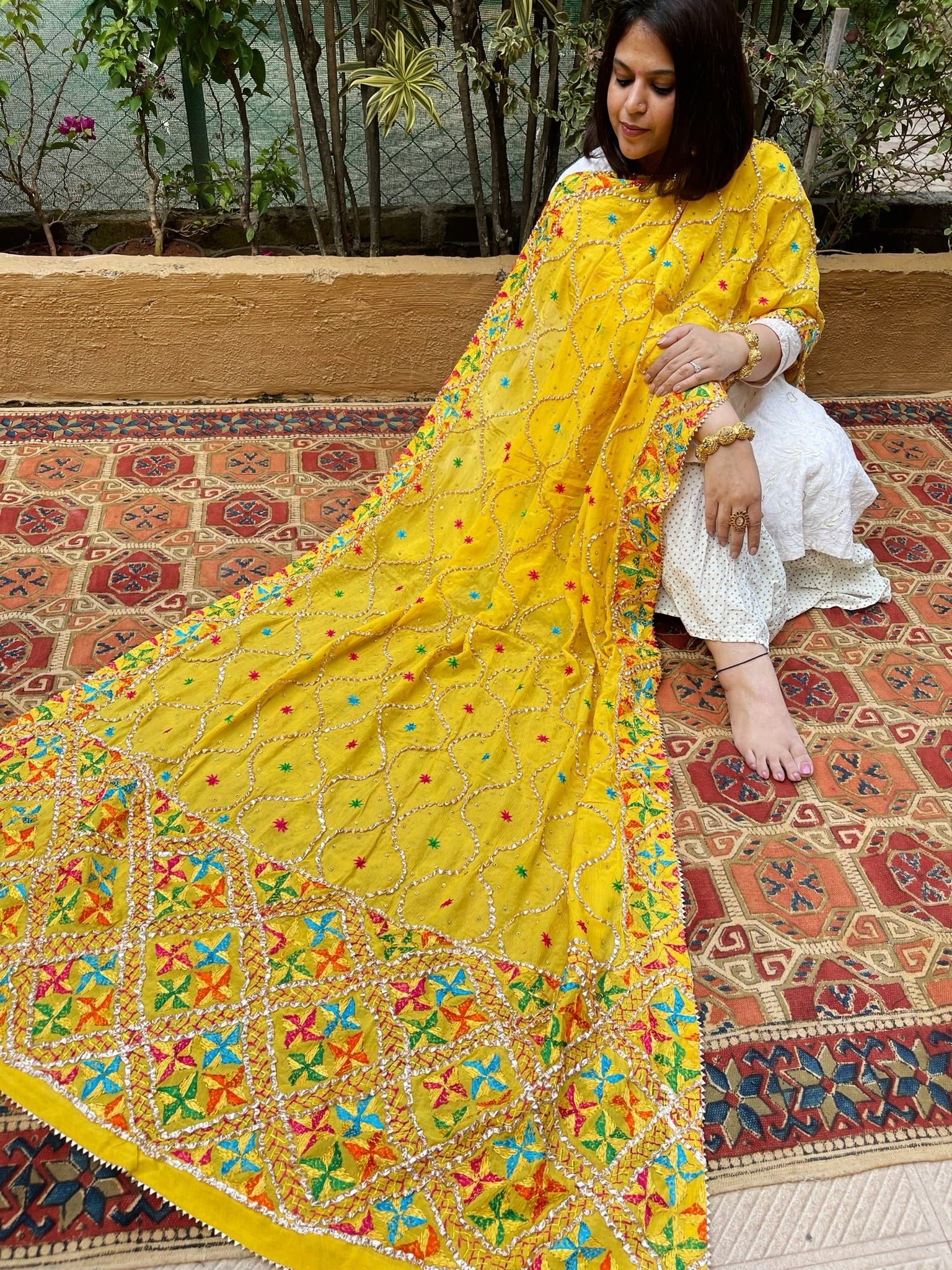 Yellow Handmade Phulkari Dupatta in Pure Chinon with Gota Handwork
