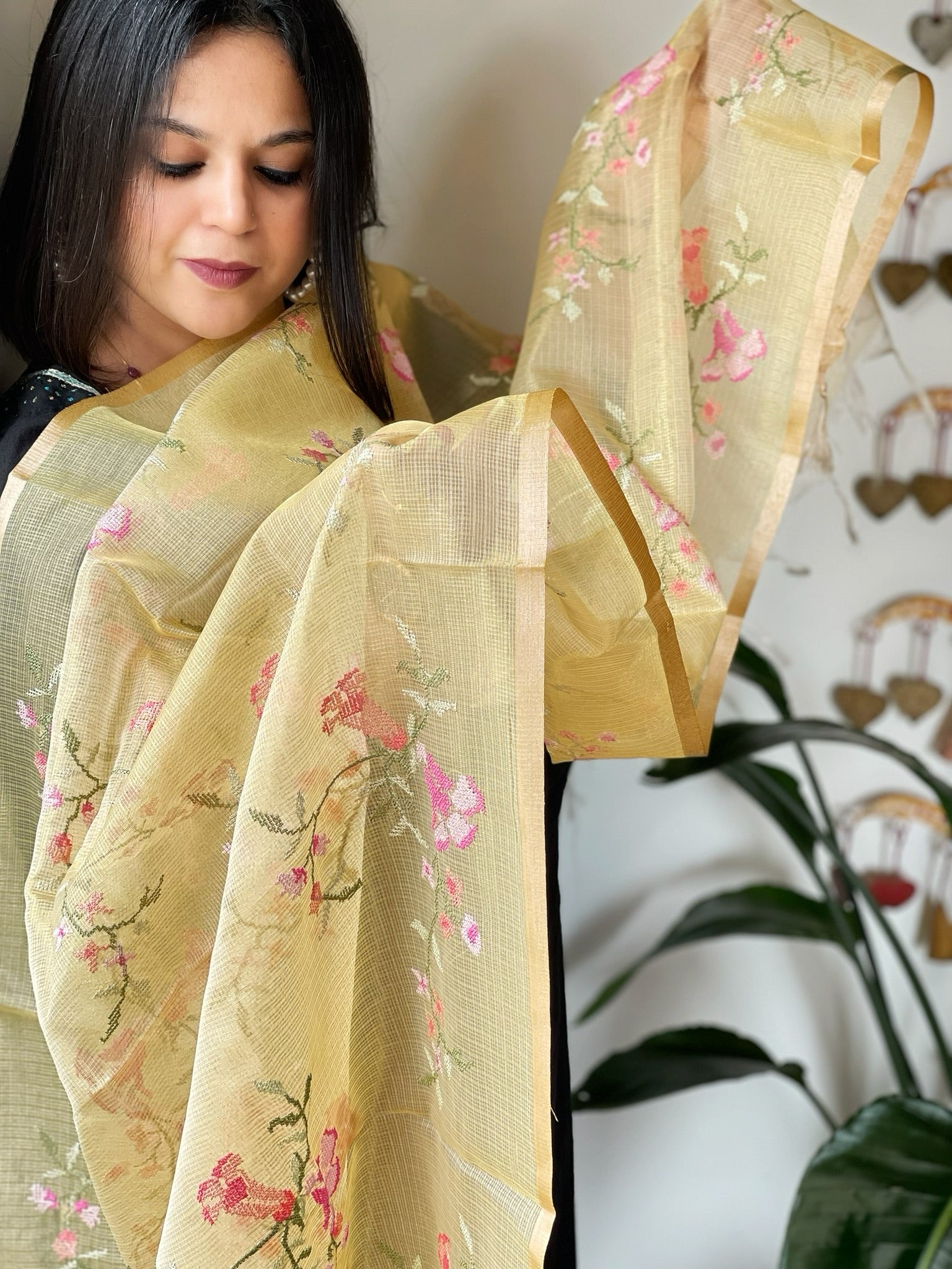 Add a touch of elegance to any outfit with our Kota Organza Cross-Stitch Embroidered Dupatta. The extensive vibrant cross-stitch embroidery ensures a secure drape, making it perfect for any occasion.